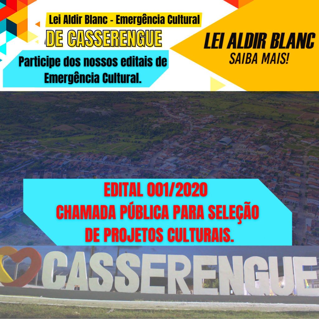 A prefeitura Municipal de Casserengue, por meio da Secretaria de Educação e Cultura, comunica que estão abertas as inscrições para participar do Edital de Chamada Pública para a Seleção de Projetos Culturais de trabalhadores da Cultura de Casserengue, onde serão selecionados 21 (vinte e um) projetos para manutenção de grupos culturais, realização de atividades de Economia Criativa, principalmente artesanato, teatro, dança e música e realizações de atividades artísticas-culturais e produção de eventos culturais que possam ser transmitidas prioritariamente pela internet ou disponibilizadas por meio de redes sociais e outras plataformas digitais, objetivando valorizar e promover a arte do artista local.
