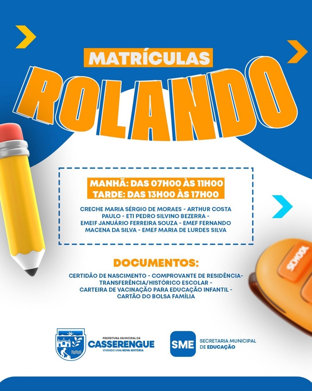 A Prefeitura de Casserengue, por meio da Secretaria Municipal de Educação, informa que o período de matrículas para as escolas da rede municipal já começou! ✏️🎒