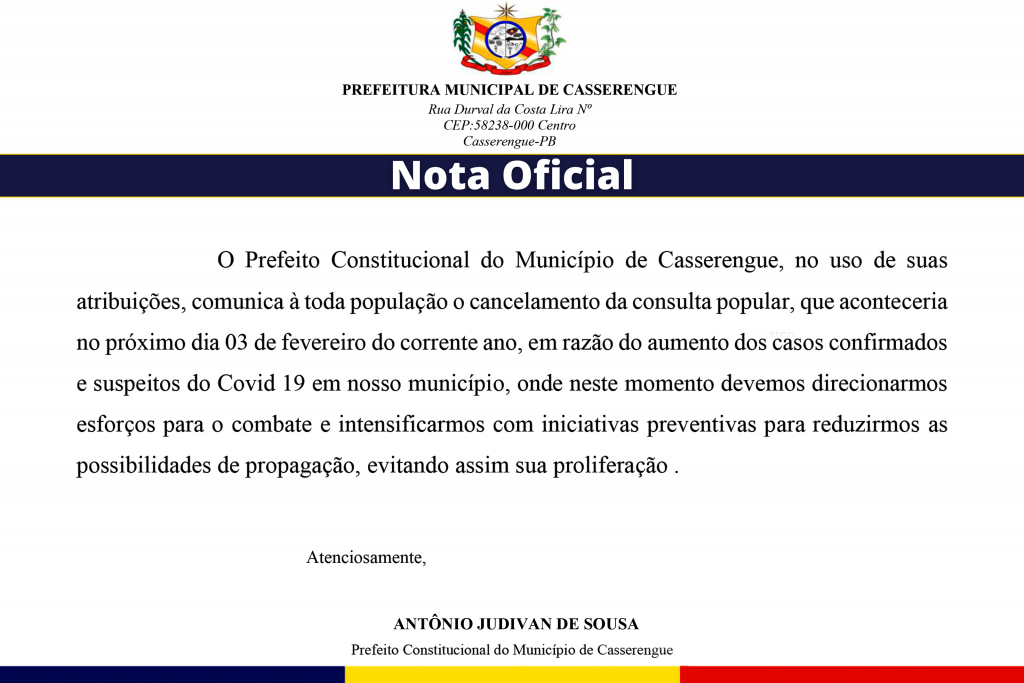 atribuições, comunica à toda população o cancelamento da consulta popular, que aconteceria