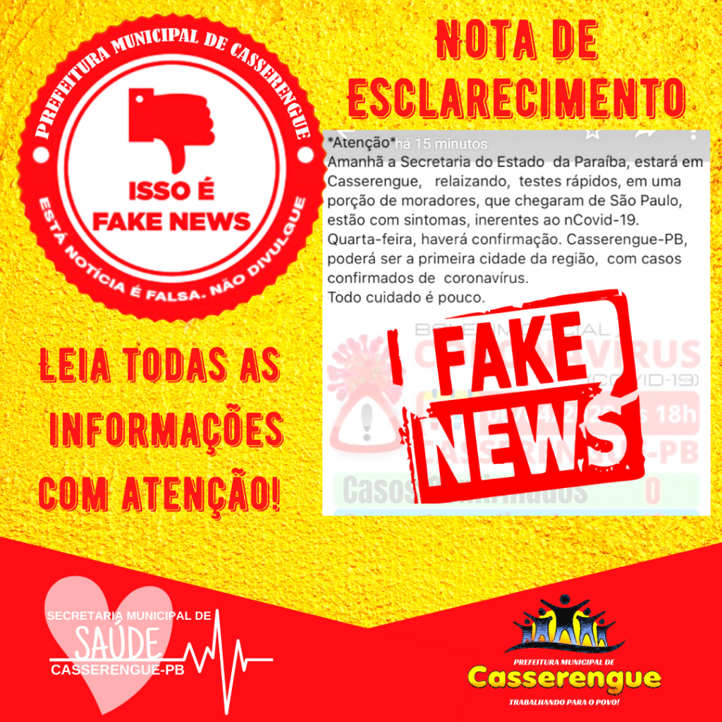 A Prefeitura Municipal de Casserengue, por meio da Secretaria Municipal de Saúde, esclarece que as notícias disseminadas em posts de terceiros em redes sociais que a secretaria do estado realizaria testes rápidos para o corona vírus e que teria casos de corona vírus no município é fake news.