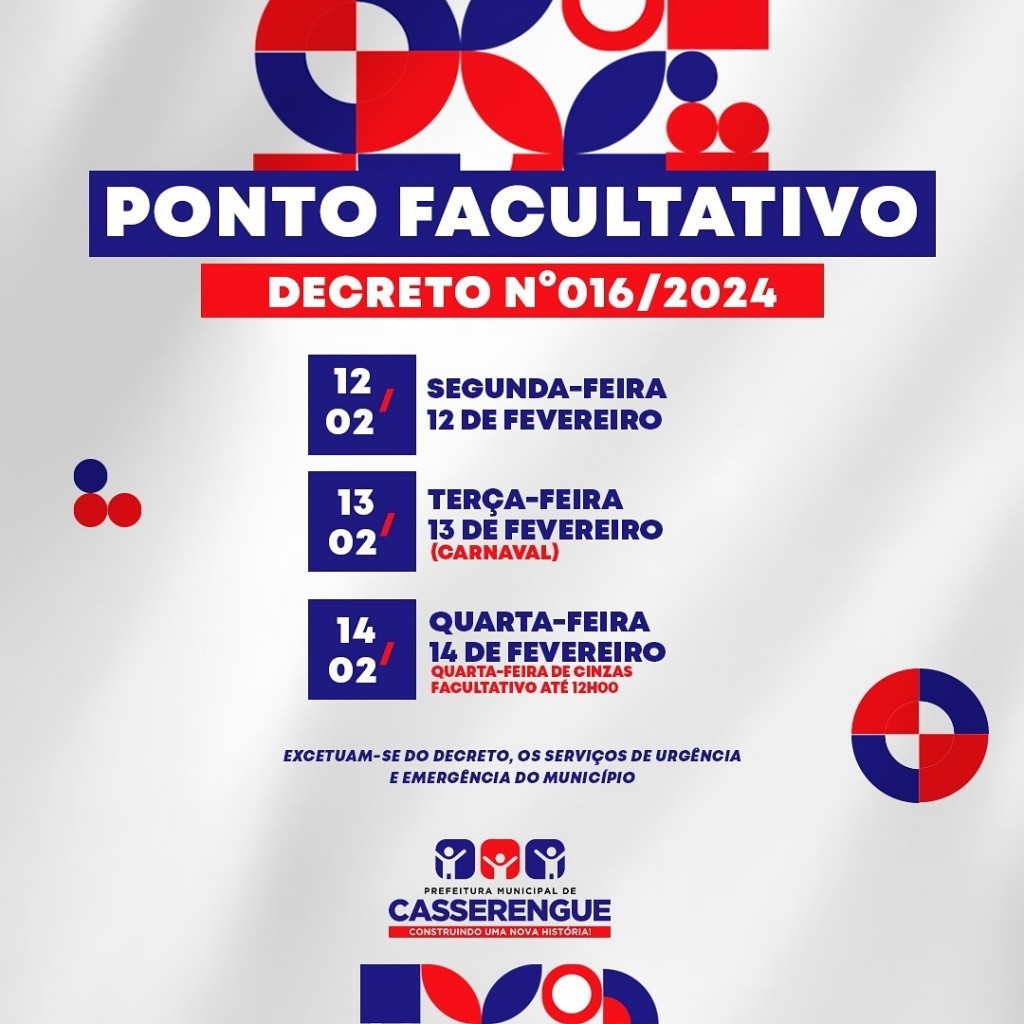 - Dia 14/02/2024 quarta-feira de cinzas, facultativo até 12:00