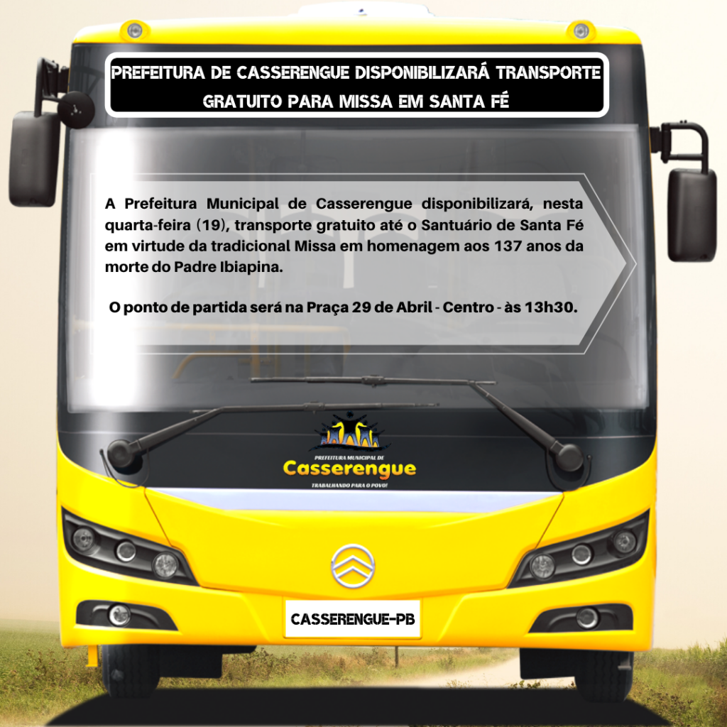 Em nome da Diretoria de Transporte Municipal (Diretor Danilo Marques), a Prefeitura Municipal de Casserengue disponibilizará, nesta quarta-feira (19), transporte gratuito até o Santuário de Santa Fé em virtude da tradicional Missa em homenagem aos 137 anos da morte do Padre Ibiapina.