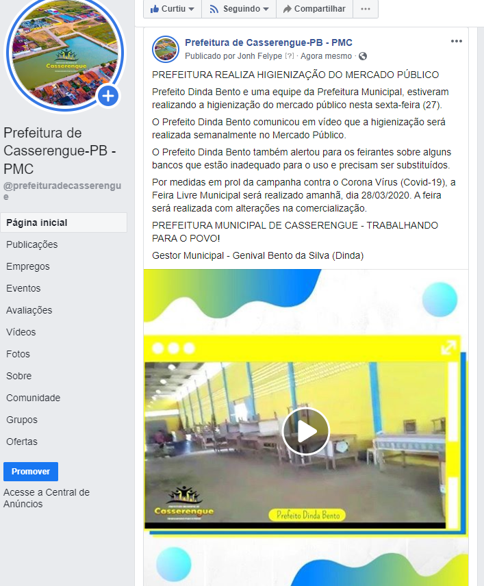 O Prefeito Dinda Bento comunicou em vídeo que a higienização será realizada semanalmente no Mercado Público.