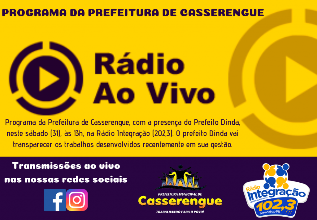 Programa da Prefeitura de Casserengue, com a presença do Prefeito Dinda, neste sábado (31), às 13h, na Rádio Integração (102,3). O prefeito Dinda vai trasnparecer os trabalhos desenvolvidos recentemente em sua gestão.