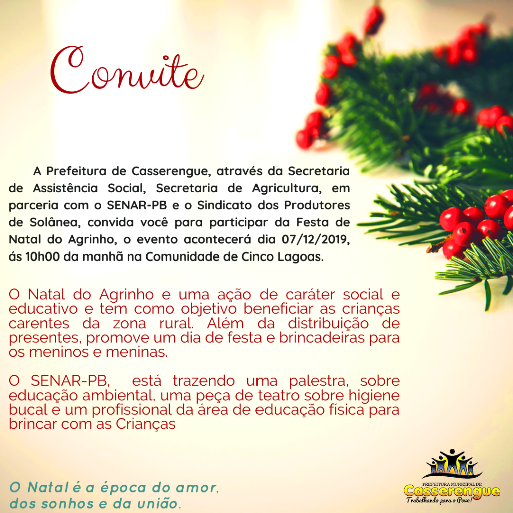 A Prefeitura de Casserengue, através da Secretaria de Assistência Social, Secretaria de Agricultura, em parceria com o SENAR-PB e o Sindicato dos Produtores de Solânea, convida você para participar da Festa de Natal do Agrinho, o evento acontecerá dia 07/12/2019, ás 10h00 da manhã na Comunidade de Cinco Lagoas.