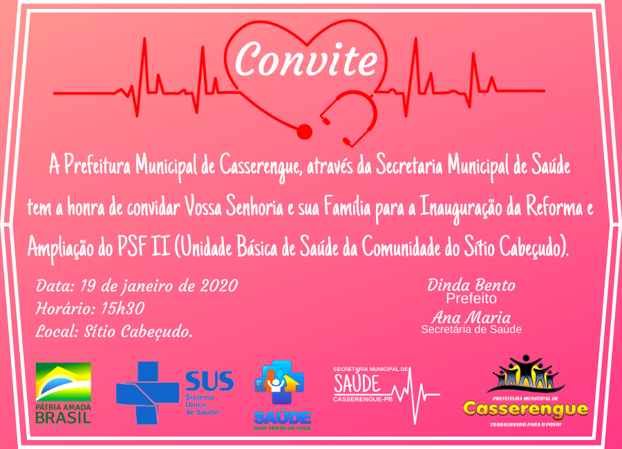 A Prefeitura Municipal de Casserengue, através da Secretaria Municipal de Saúde tem a honra de convidar Vossa Senhoria e sua Família para a Inauguração da Reforma e Ampliação do PSF II (Unidade Básica de Saúde da Comunidade do Sítio Cabeçudo).