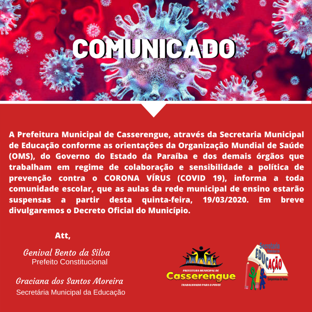 A Prefeitura Municipal de Casserengue, através da Secretaria Municipal de Educação conforme as orientações da Organização Mundial de Saúde (OMS), do Governo do Estado da Paraíba e dos demais órgãos que trabalham em regime de colaboração e sensibilidade a política de prevenção contra o CORONA VÍRUS (COVID 19), informa a toda comunidade escolar, que as aulas da rede municipal de ensino estarão suspensas a partir desta quinta-feira, 19/03/2020. Em breve divulgaremos o Decreto Oficial do Município.