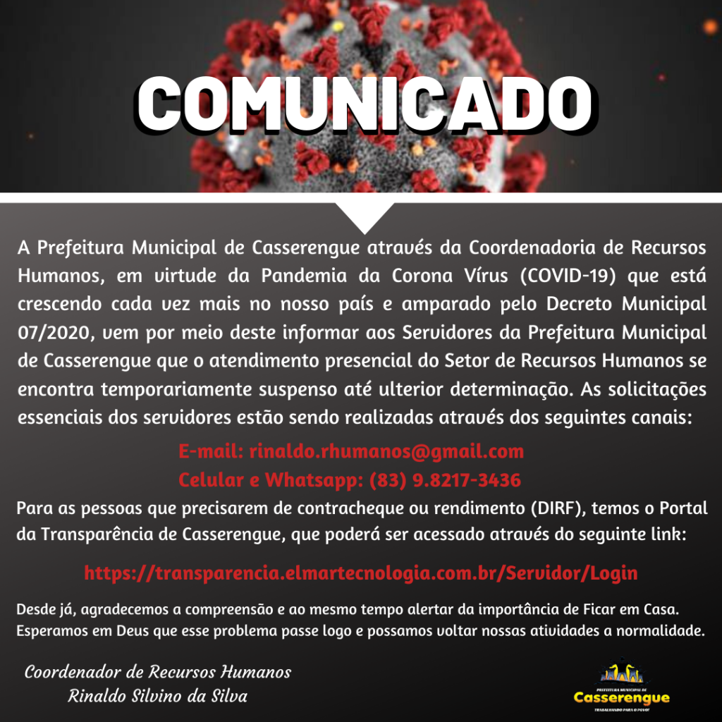 A Prefeitura Municipal de Casserengue através da Coordenadoria de Recursos Humanos, em virtude da Pandemia da Corona Vírus (COVID-19) que está crescendo cada vez mais no nosso país e amparado pelo Decreto Municipal 07/2020, vem por meio deste informar aos Servidores da Prefeitura Municipal de Casserengue que o atendimento presencial do Setor de Recursos Humanos se encontra temporariamente suspenso até ulterior determinação. As solicitações essenciais dos servidores estão sendo realizadas através dos seguintes canais: