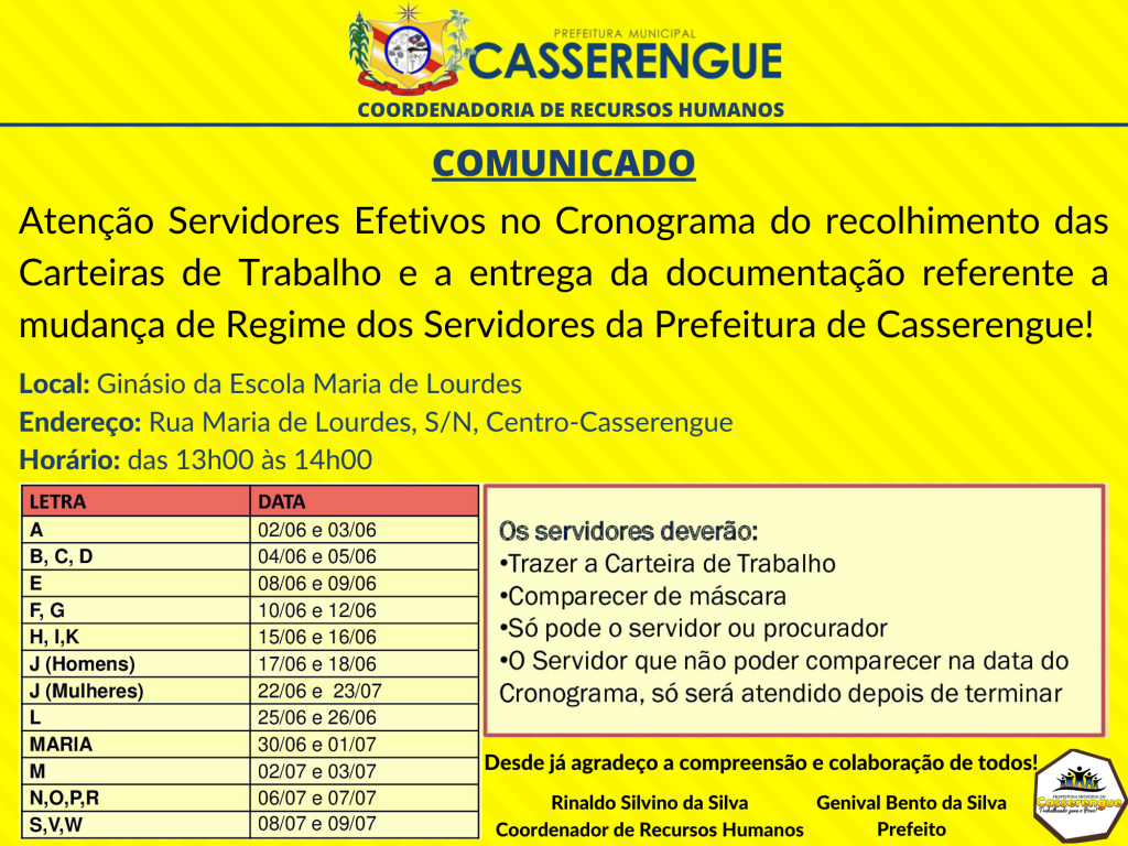Atenção Servidores Efetivos no Cronograma do recolhimento das Carteiras de Trabalho e a entrega da documentação referente a mudança de Regime dos Servidores da Prefeitura de Casserengue!