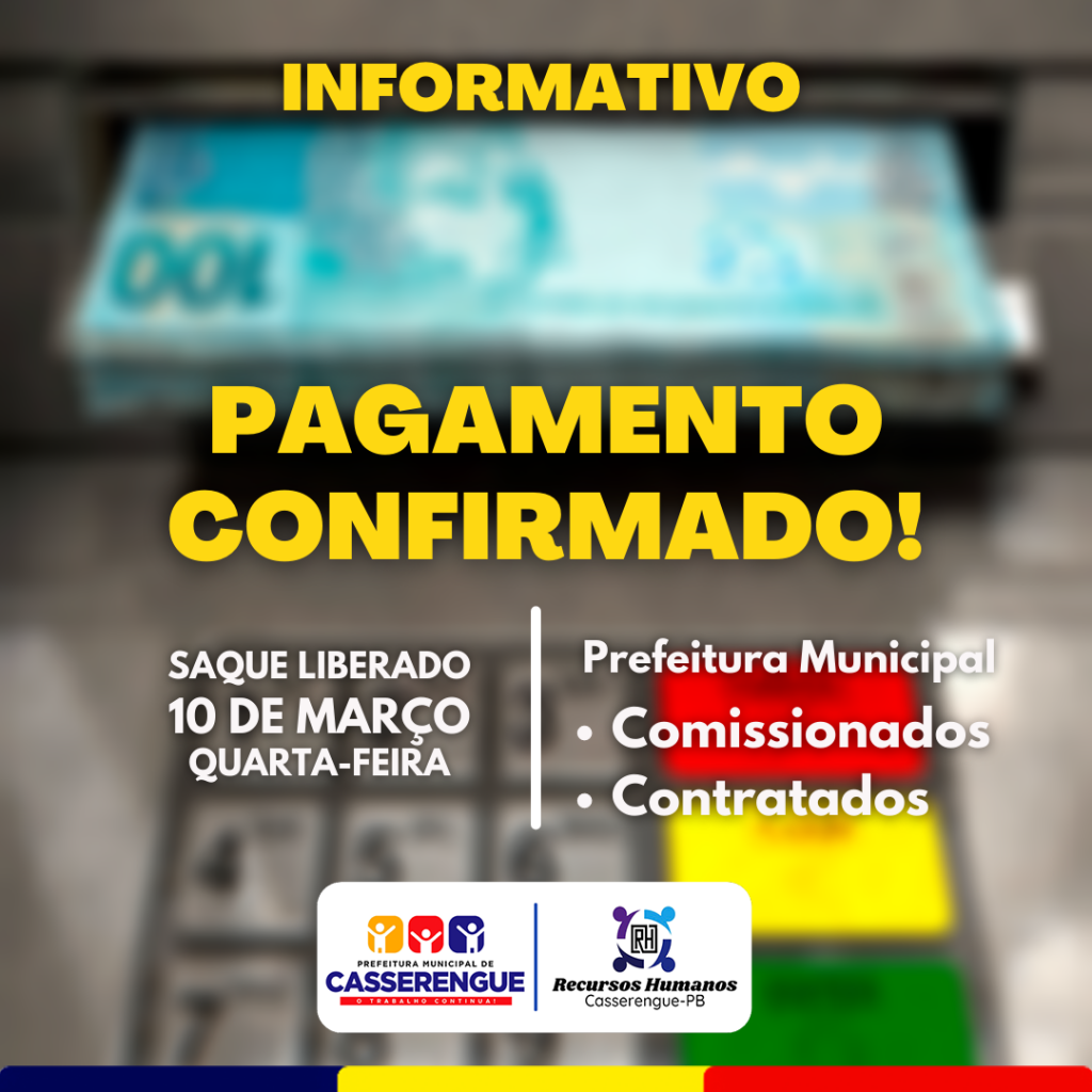 Cumprindo o calendário de pagamentos do funcionalismo, a Prefeitura Municipal de Casserengue informa o pagamento dos servidores municipais, contratos e comissionados hoje, 10 de março de 2021. Os proventos são referentes ao mês de fevereiro 2021.