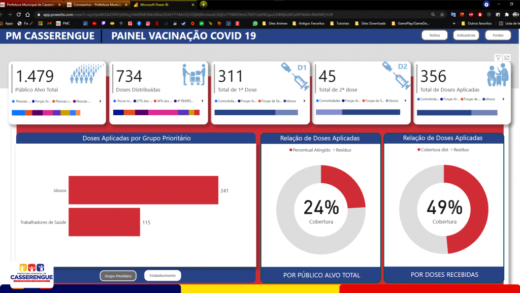 O Painel de Monitoramento da Vacinação contra a Covid-19 pode ser acessado por este endereço eletrônico, ou acesse: ( https://www.casserengue.pb.gov.br/pagina/coronavirus ). A ferramenta apresenta a soma de doses registradas no sistema de informações, público-alvo das fases da campanha, porcentagem do público-alvo vacinado para a fase atual da campanha e gráficos com doses administradas diariamente e registradas, além de número acumulado de doses administradas. Os dados são atualizados a cada hora a partir da inserção de registros no sistema de informação da campanha pelos estabelecimentos de saúde.