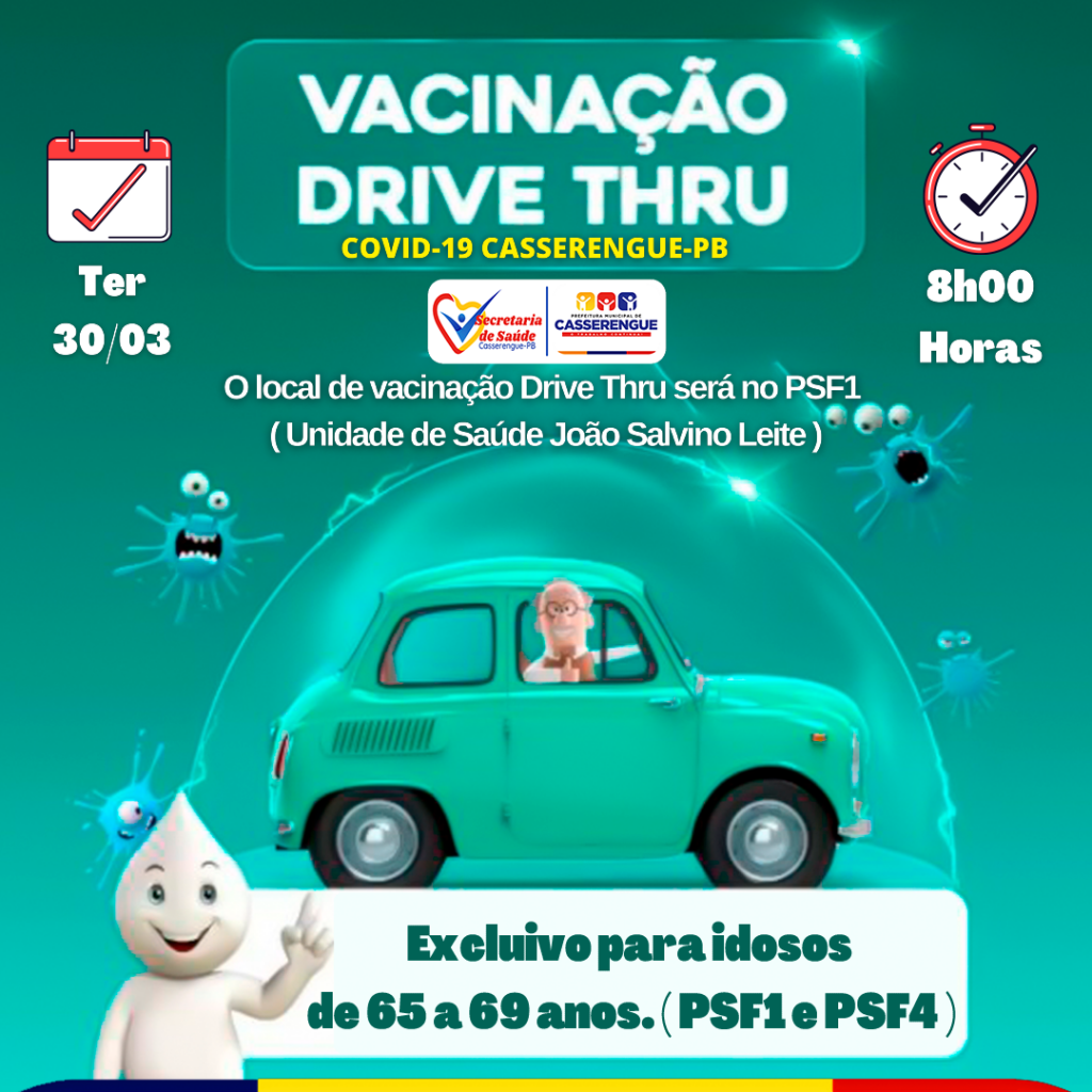 As pessoas do PSF1 e PSF4 de 65 a 69 anos poderão se vacinar por meio do serviço de drive thru a partir desta terça-feira, 30/03. A Prefeitura de Casserengue, por meio da Secretaria de Saúde colocará em operação o recurso para agilizar a vacinação de idosos contra a Covid-19, garantido o distanciamento social orientado como medida para evitar a contaminação pelo novo coronavírus.
