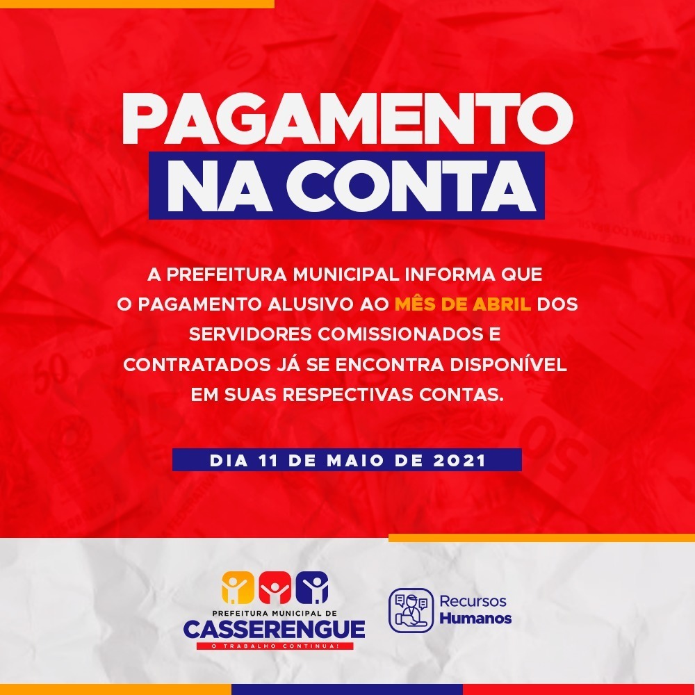 A Prefeitura Municipal de Casserengue informa que o pagamento alusivo ao mês de #abril dos servidores comissionados e contratados já se encontra disponível em suas respectivas contas.