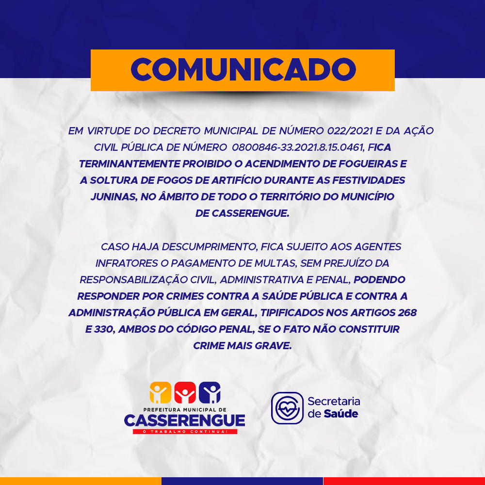 Em virtude do Decreto Municipal de número 022/2021 e da Ação Civil Pública de Número 0800846-33.2021.8.15.0461, FICA TERMINANTEMENTE PROIBIDO O ACENDIMENTO DE FOGUEIRAS E A SOLTURA DE FOGOS DE ARTIFÍCIOS DURANTE AS FESTIVIDADES JUNINAS, NO ÂMBITO DE TODO O TERRITÓRIO DO MUNICÍPIO DE CASSERENGUE.