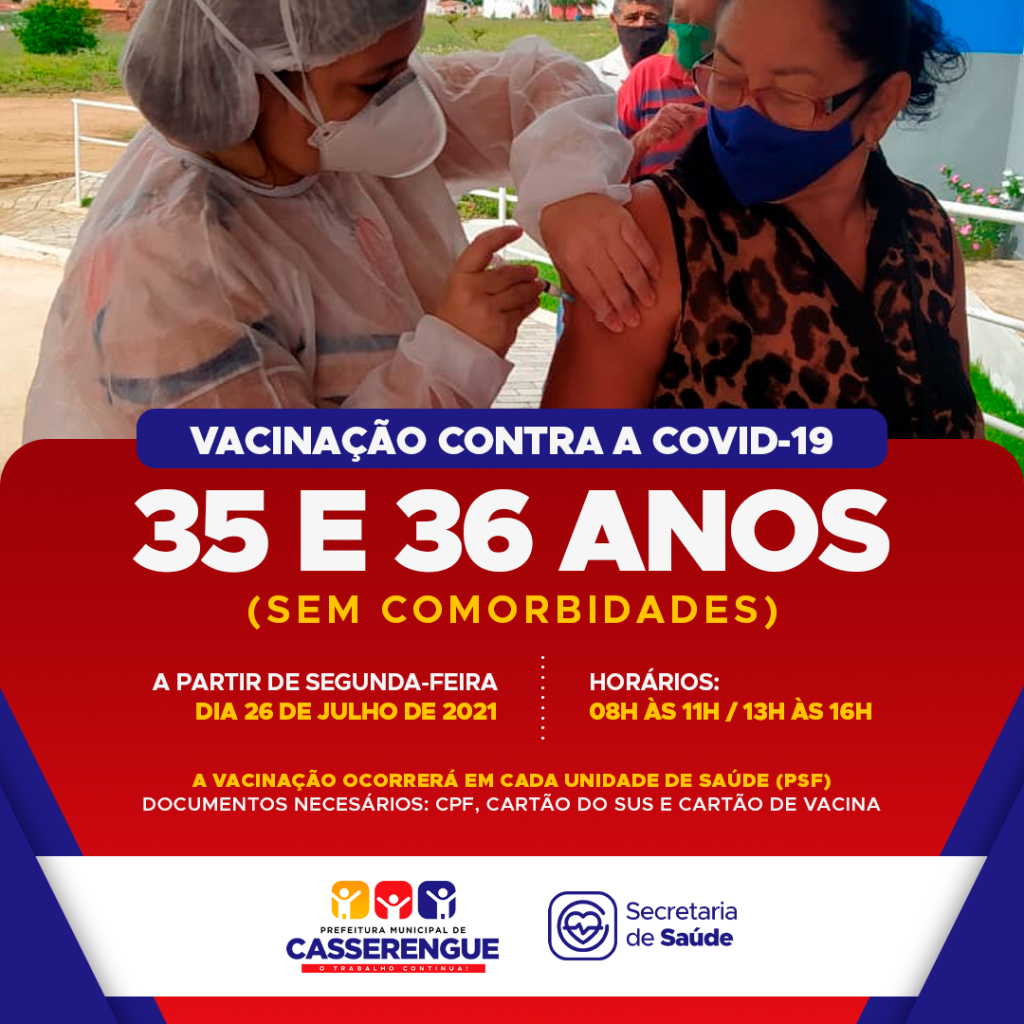 A partir desta segunda-feira (26), iniciaremos a vacinação das pessoas com 35 e 36 anos acima - sem comorbidades. 🦯💛⠀⠀