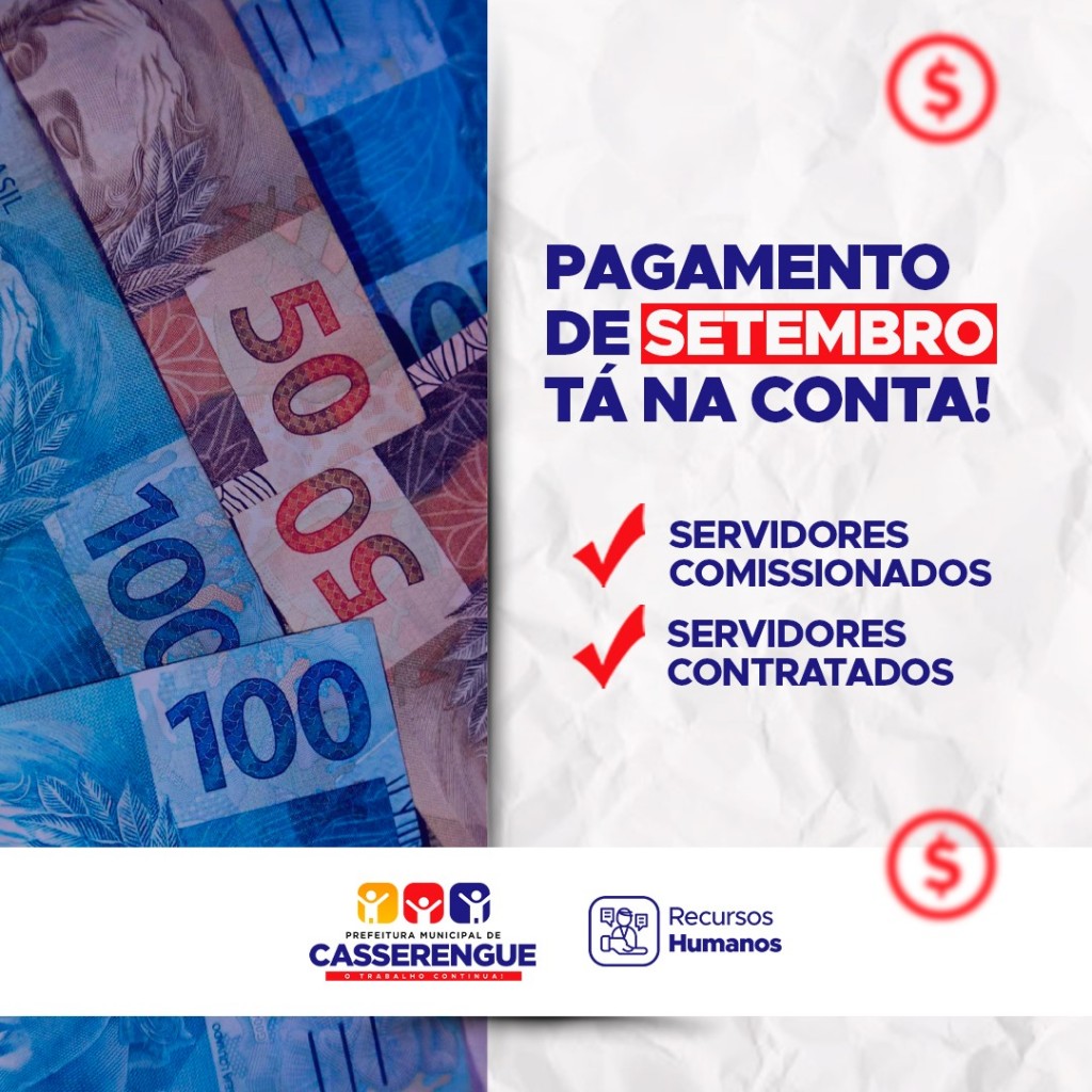 A Prefeitura Municipal de Casserengue informa que o pagamento alusivo ao mês de Setembro dos servidores comissionados e contratados já se encontra disponível em suas respectivas contas.⠀