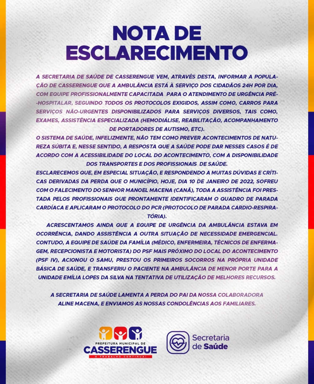 Esclarecemos que, em especial situação, e respondendo a muitas dúvidas e críticas derivadas da perda que o município, hoje, dia 10 de janeiro de 2022, sofreu com o falecimento do Senhor Manoel Macena (Canã), toda a assistência foi prestada pelos profissionais que prontamente identificaram o quadro de parada cardíaca e aplicaram o protocolo do PCR (Protocolo de Parada Cardio-Respiratória).
