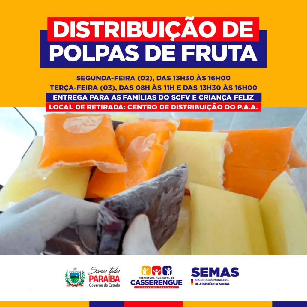 A Secretaria Municipal de Assistência Social realizará nesta segunda e terça-feira (02 e 03/Maio), em parceria com o Governo Estadual e a Secretaria Executiva de Segurança Alimentar e Economia - Solidária vinculada a - SEDH - a entrega de Polpas de Frutas do Programa de Aquisição de Alimentos (PAA) para as famílias do SCFV e Criança Feliz.