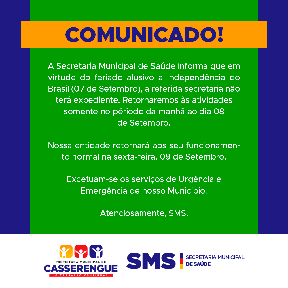 A Secretaria Municipal de Saúde informa que em virtude do feriado alusivo a Independência do Brasil (07 de Setembro), a referida secretaria não terá expediente. Retornaremos às atividades somente no périodo da manhã ao dia 08 de Setembro.