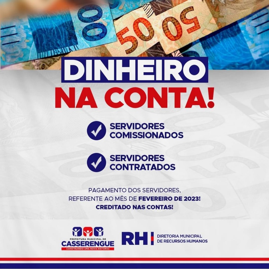 A Prefeitura de Casserengue por meio da Diretoria de Recursos Humanos informa que o pagamento alusivo ao mês de Fevereiro de 2023 já está disponível em conta para retirada.