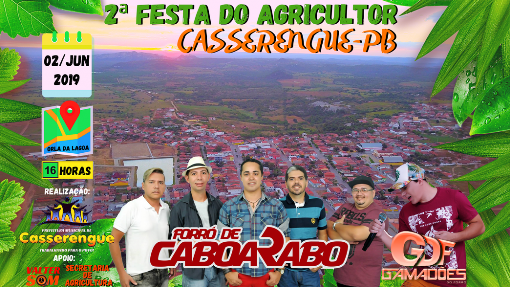 Segunda Festa do Agricultor, uma festa especial que acontecerá no domingo, dia 02 de jun/2019, a partir das 16 horas, na Orla da Lagoa. O evento é promovido pela Prefeitura de Casserengue, por meio da Secretaria Municipal de Agricultura. A festa do agricultor teve sua primeira edição no ano passado (2018), o prefeito Dinda, na primeira edição falou na proposta de tornar o evento uma tradição no nosso município, dando apoio especial aos nossos agricultores e a agricultura familiar.
