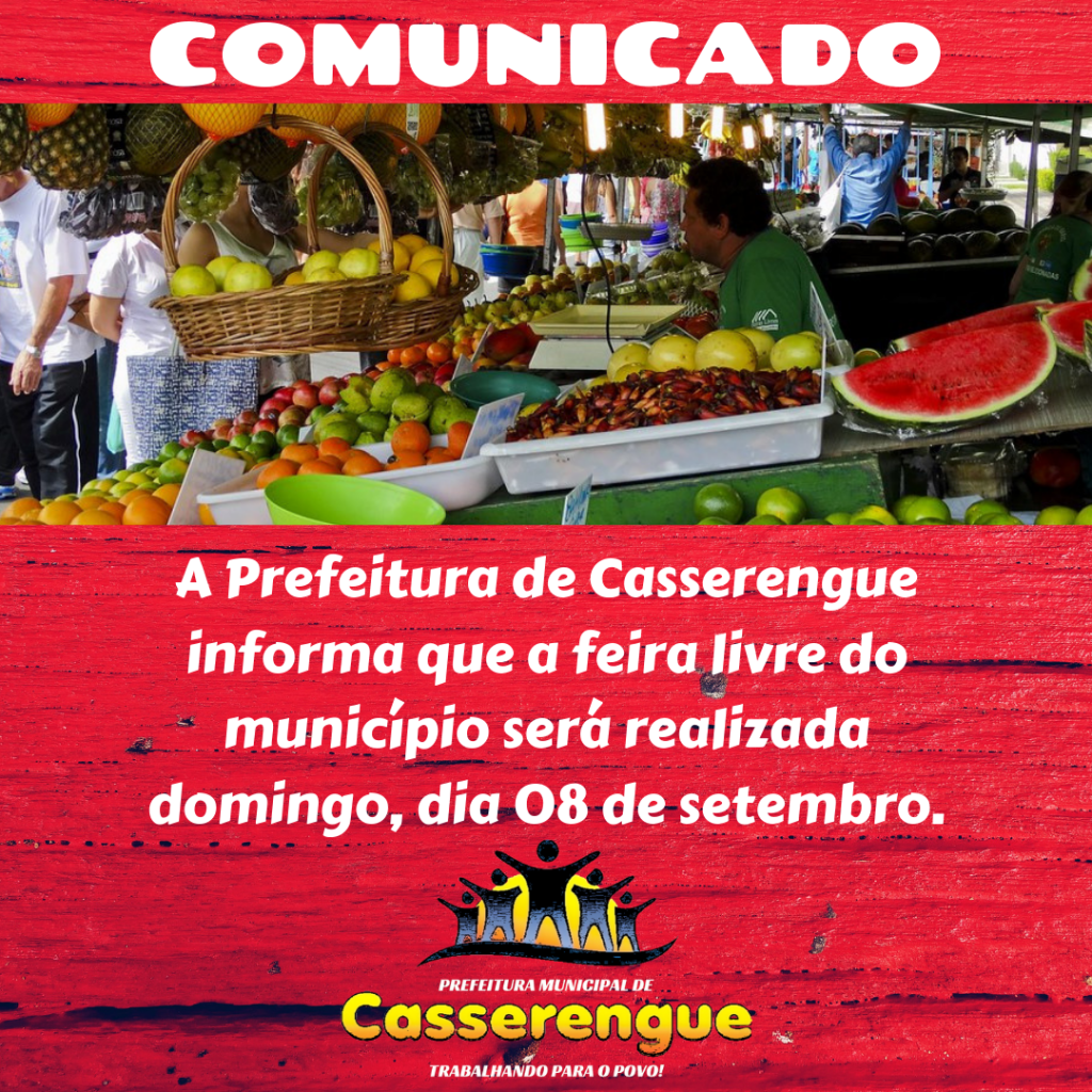A Prefeitura de Casserengue informa que a feira livre do município será realizada domingo, dia 08 de setembro.