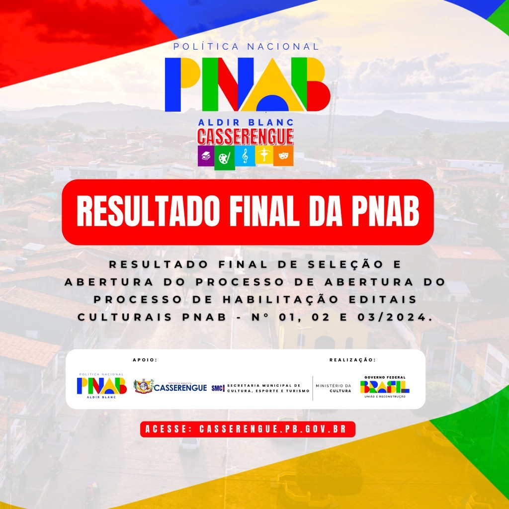 A Prefeitura Municipal de Casserengue-PB, por meio da Secretaria de Cultura, torna público o resultado final da seleção dos Editais Culturais PNAB - N° 01, 02 e 03/2024. O processo de habilitação dos contemplados será iniciado conforme os prazos e orientações estabelecidos nos editais.