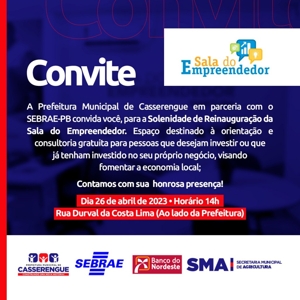 A Prefeitura Municipal de Casserengue em parceria com o SEBRAE-PB convida você, para a Solenidade de Reinauguração da Sala do Empreendedor. Espaço destinado à orientação e consultoria gratuita para pessoas que desejam investir ou que já tenham investido no seu próprio negócio, visando fomentar a economia local. Contamos com sua honrosa presença.