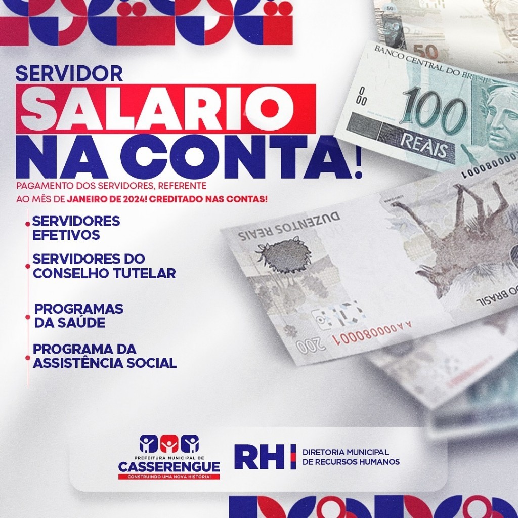 O pagamento dos servidores referente ao mês de janeiro de 2024 já se encontra disponível para retirada.