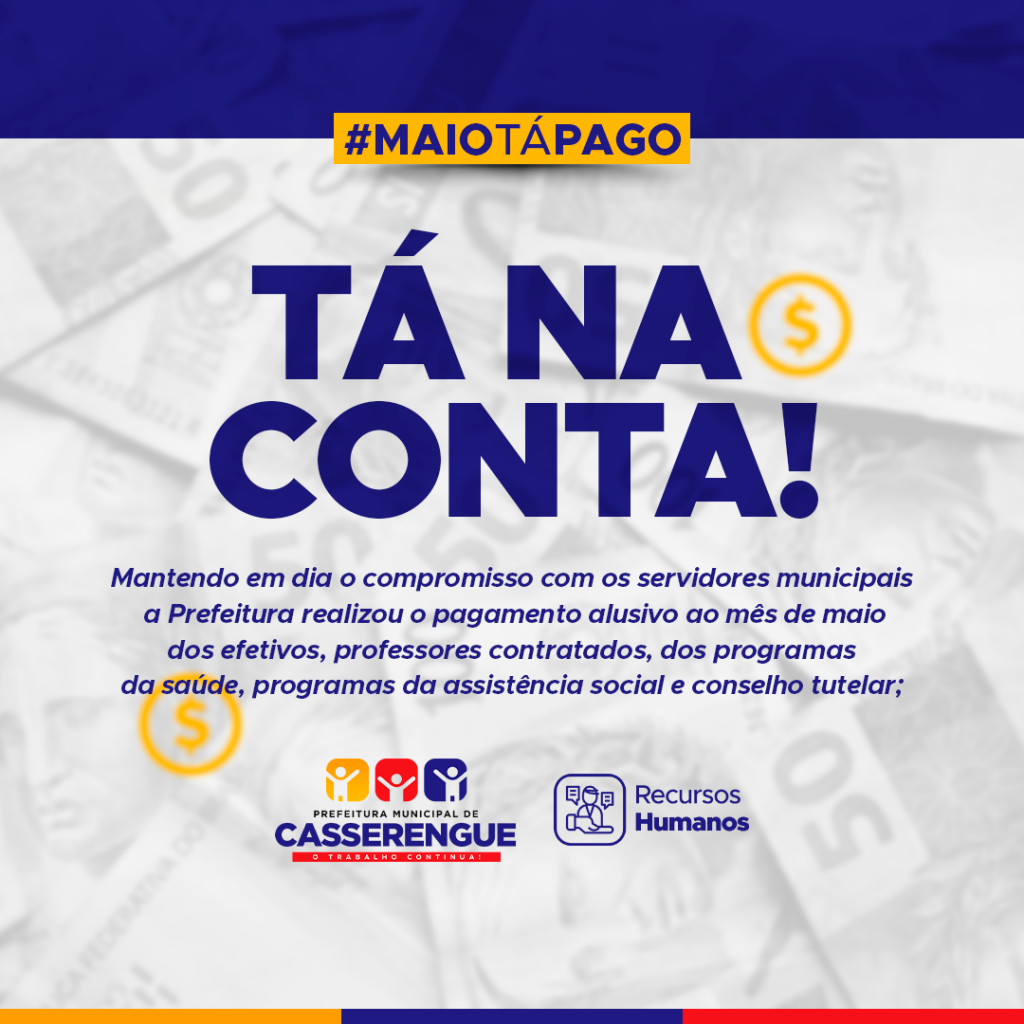 A Prefeitura de Casserengue realizou o pagamento alusivo ao mês de maio dos funcionários efetivos, professores contratados, programas de saúde, programas de assistência social e do conselho tutelar neste sábado (29/maio).