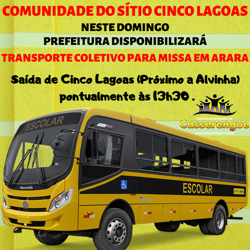 Em nome do Diretor de Transporte Municipal, Danilo Marques, através da Prefeitura Municipal de Casserengue, a Comunidade do Sítio Cinco Lagoa terá transporte coletivo para Missa na cidade de Arara neste domingo, 08 de Setembro.