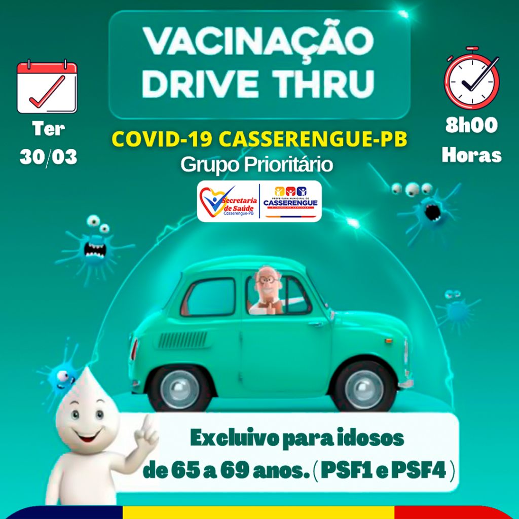 O local de vacinação Drive Thru será no PSF1 (Unidade de Saúde João Salvino Leite), com início às 8h00