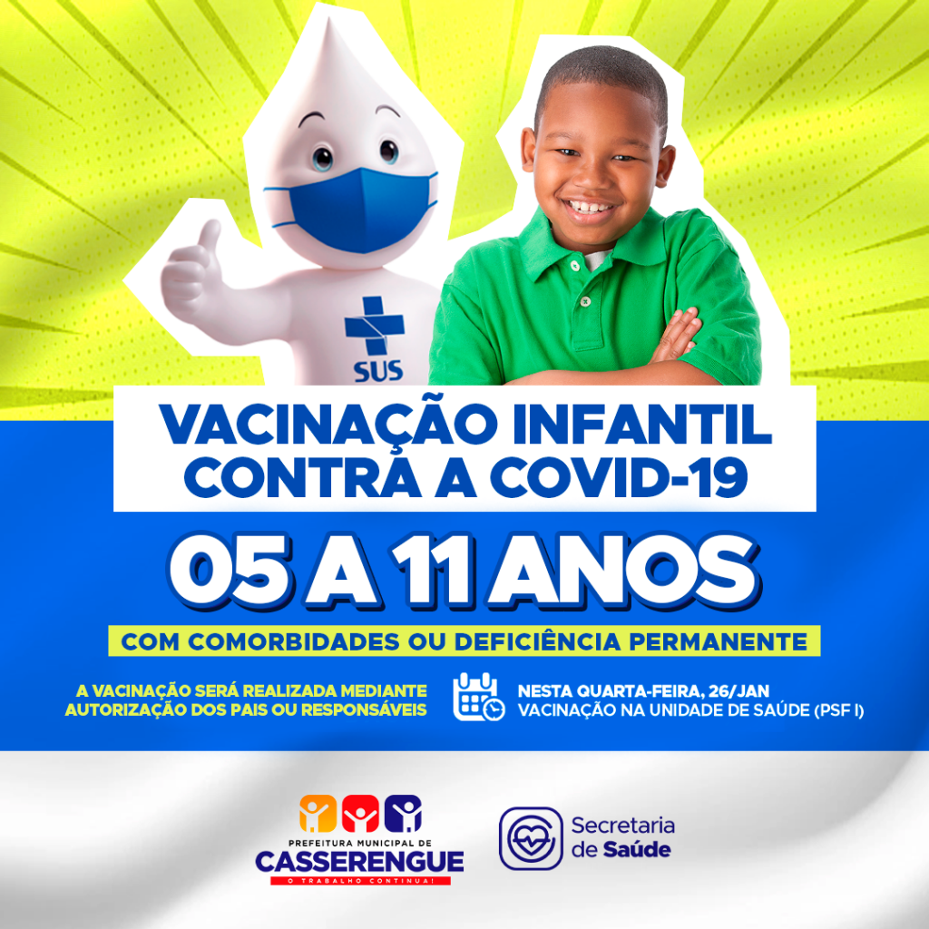 Tem vacina chegando para nossas crianças na próxima quarta-feira (26), estaremos aplicando a 1ª dose do imunizante contra a covid-19 nas crianças de 05 a 11 anos com comorbidades ou deficiência permanente.