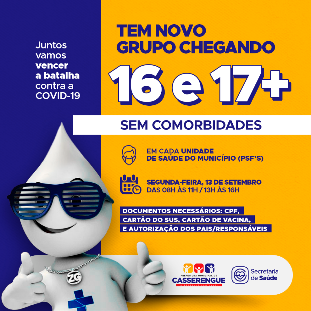 Vocês estão prontos para um novo grupo na vacinação contra a COVID-19?! ❤📌 Nesta segunda-feira (13/set) iniciaremos a vacinação de TODOS os jovens de 16 e 17 anos SEM COMORBIDADES.