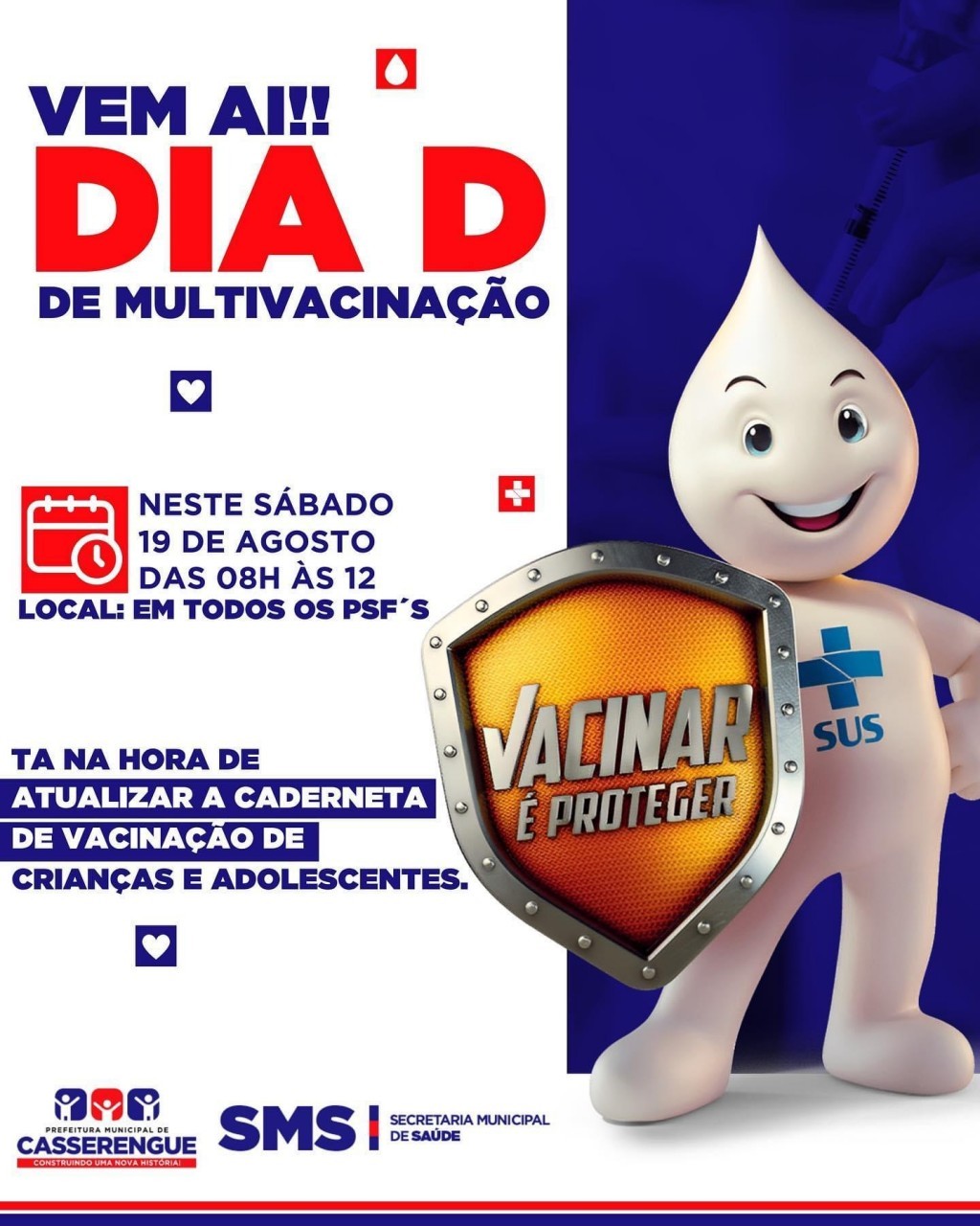 A Secretaria Municipal de Saúde, informa que nesse sábado 19 de agosto acontecerá o dia D de multivacinação.