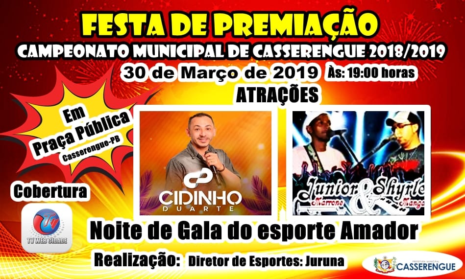 O Diretor de Esporte Municipal, por meio da Prefeitura Municipal, vem através deste, convidar a V. Sª para participar da FESTA DE PREMIAÇÃO DO CAMPEONATO MUNICIPAL DE FUTEBOL 2019.