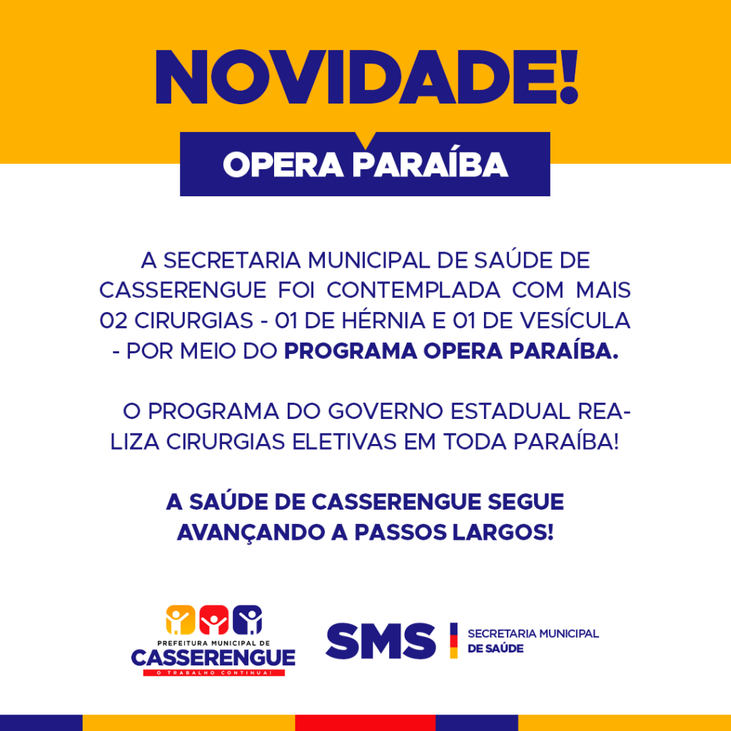 A Secretaria Municipal de Saúde de Casserengue foi contemplada com mais 02 cirurgias - 01 de Hérnia e 01 de Vesícula - por meio do Programa Opera Paraíba.