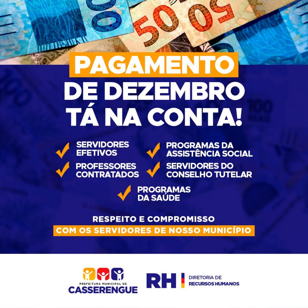 A Prefeitura de Casserengue informa que o pagamento do mês de Dezembro já está na conta dos servidores efetivos, do conselho tutelar, dos programas da saúde, da assistência social e dos professores contratados.