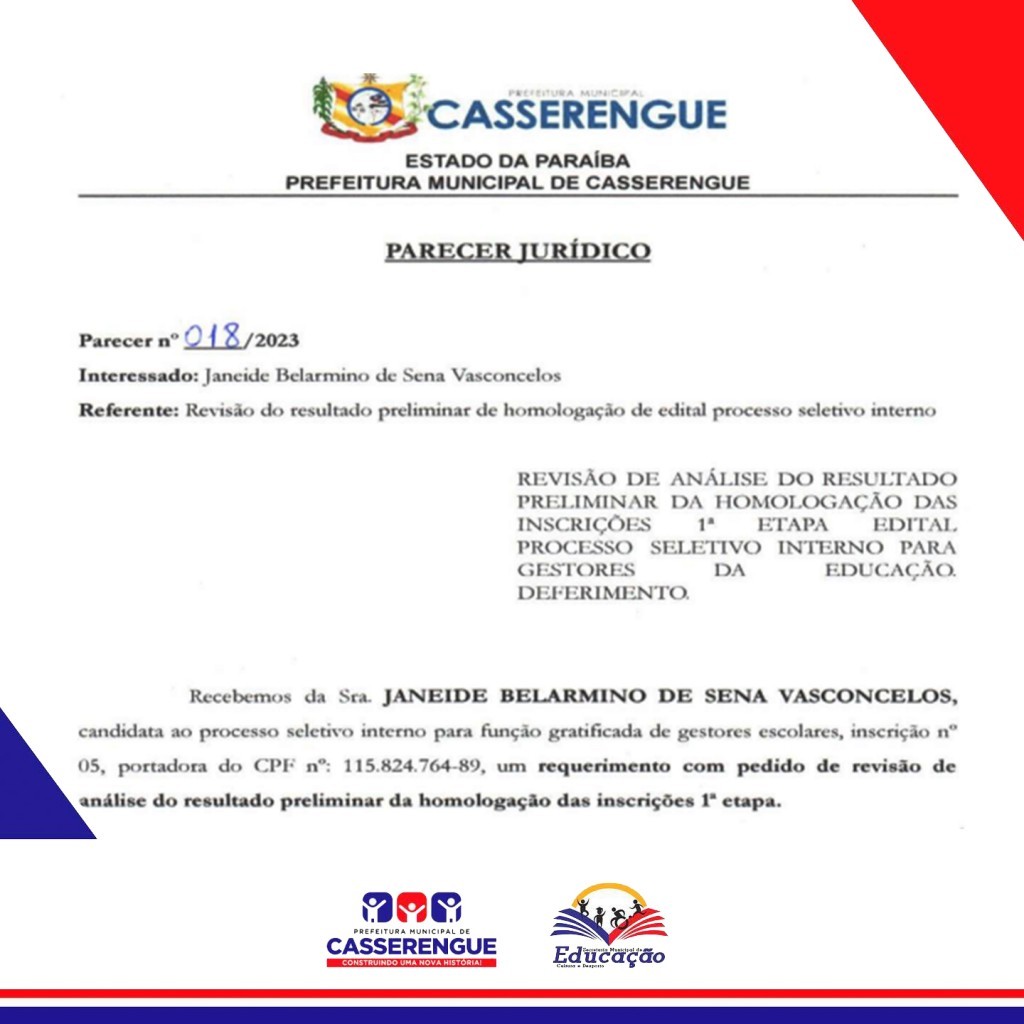 Link do Documento em Publicações: PARECER JURÍDICO N° 018/2023 | Documentos - Prefeitura Municipal de Casserengue